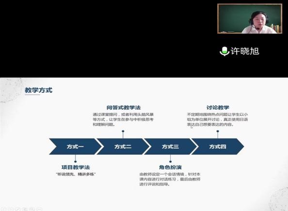 五、国际教育学院小语种教研室的许晓旭老师基于目前疫情背景下线上教学的学情状况,结合日语的学科特色分享了如何充分利用丰富的网络教学资源和多样的教学手段构建线上生态课堂的教学模式,通过更科学的教学方式破除传统教学模式对于重基础学习而轻实践训练的偏重,明确语言类教学更加注重基础理论与实践教学结合的目的,不仅要将语言作为发音的辨识,更通过反复的语言应用来提升学习的实用性。在教学中引入思政教育,引导学生通过中日文化的对比学习培养学生的文化包容心态,让学生在今后的日语学习中始终以一种开放与接纳的广阔视角,以爱国主义情怀去辨别、吸收和学习新的知识。针对疫情背景下线上教学中学生无法参与课堂学习的一些特殊情况,采用录屏、群交流、课后辅导等方式“保供”教学,通过“课程思政”与趣味日语课堂教学相融合的探索与实践,使日语教学迈向一个新的更高的台阶。
