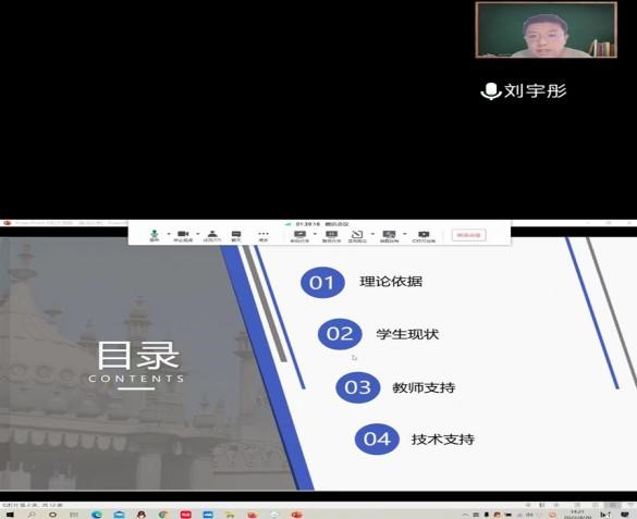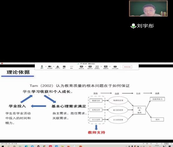 四、公共外语第二教研室的刘宇彤老师基于学习效果、学习投入以及心理需求满足的三元模型,以线上教育质量提升为契机,提出自主支持、能力支持和情感支持的三维师源性线上外语教育模式。并结合我校学生外语学习情绪特点以及疫情期间特殊的学习环境,从教育技术、学能发展和心理抚慰三个角度着手,开设寓教于乐、丰富多彩的沉浸式外语课堂。在教育技术方面,刘宇彤老师重点介绍了腾讯会议互动批注和外语网页朗读功能,增加课程中师生互动,激发学生学习兴趣,促使学生学习动机内化,帮助学生获得主动学习的能力。在能力支持方面,刘宇彤老师创新利用网络视频资源,使学生在单词学习过程中“视”“听”“说”相结合,实现了从“机械式”向“沉浸式”的转变。在情感支持方面,刘宇彤老师使用微信与学生积极沟通,对于正处于隔离中的学生进行鼓励支持、情感抚慰。利用课前和课间10分钟播放音乐帮助学生舒缓由封控引发的消极情绪,提升师生情感粘度,加强学生对老师的依赖和信任度,打造符合“E时代”+“疫时期”特点的新教育范式。