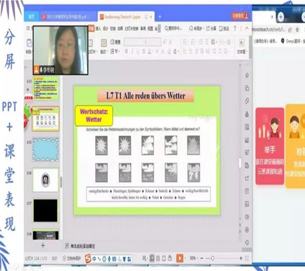 二、德语教研室李冬明老师结合基础德语IV课程,从教学手段、教学方法及内容、教学评价及反馈、课程思政几个方面分享了在线教学的经验。教学手段方面,同时使用手机和电脑两个设备开启腾讯会议和云班课进行课堂教学;利用B站、每日德语听力等手机软件,搜索相关可用视频等学习资源发布至云班课供学生学习;推荐学生使用较为精准的德语在线翻译软件辅助学习。教学方法及内容方面,使用分屏技术同时在腾讯会议共享屏幕上线上展示PPT、电子教材和云班课的签到、课堂活动、轻直播等内容,使学生能直接在屏幕上用时看到老师讲的内容、自己参与的活动以及老师加的经验值,更直观的刺激学生参与课堂活动;使用腾讯会议的互动批注功能,直接在屏幕上划重点、加注释、做习题,学生也可以在各自设备屏幕上直接进行批注答题,增加学生学习的趣味性。教学评价及反馈方面,主要分享了作业/小组任务的评分经验,同时利用云班课的小墨周报反馈学生在本周的学习情况。课程思政方面,分享了结合课程内容进行的课程思政案例。老师们通过经验分享,丰富了教学方法及手段,提升了在线教学能力。